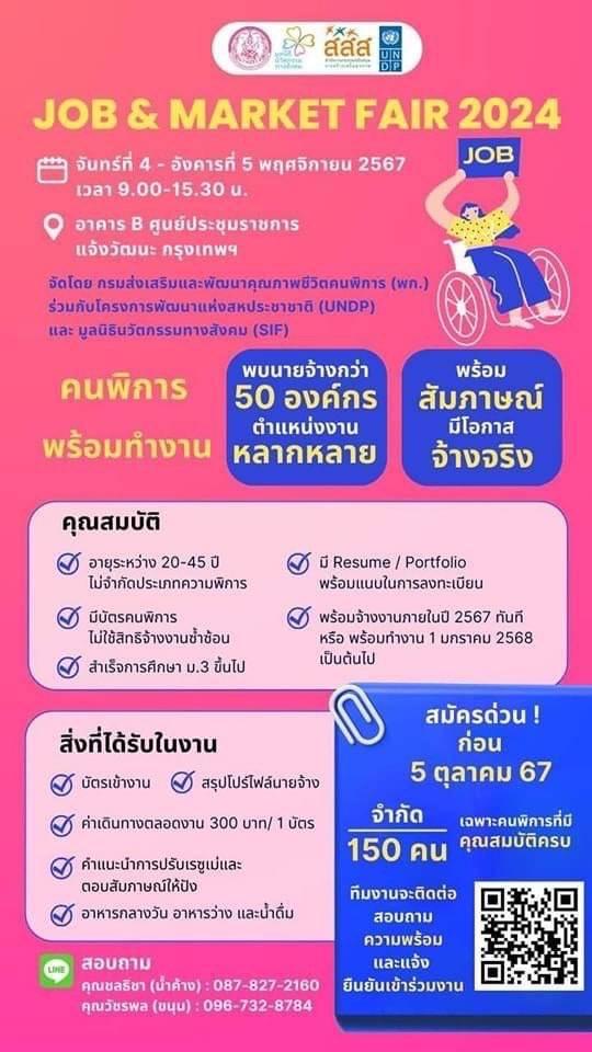 หากคุณเป็นคนพิการที่พร้อมทำงานและกำลังมองหางานอยู่ขอเชิญลงทะเบียนแสดงความสนใจเข้าร่วมงาน Job & Market Fair 2024 วันที่ 4-5 พฤศจิกายน 2567 ณ อาคาร B ศูนย์ราชการ แจ้งวัฒนะ กทม. พบนายจ้างหลากหลายตำแหน่งงานกว่า 50 องค์กร พร้อมสัมภาษณ์จ้างจริง จัดโดย (พก.)กรมส่งเสริมคุณภาพชีวิตคนพิการ ร่วมกับโครงการพัฒนาแห่งสหประชาชาติ (UNDP) และ มูลนิธินวัตกรรมทางสังคม (SIF)