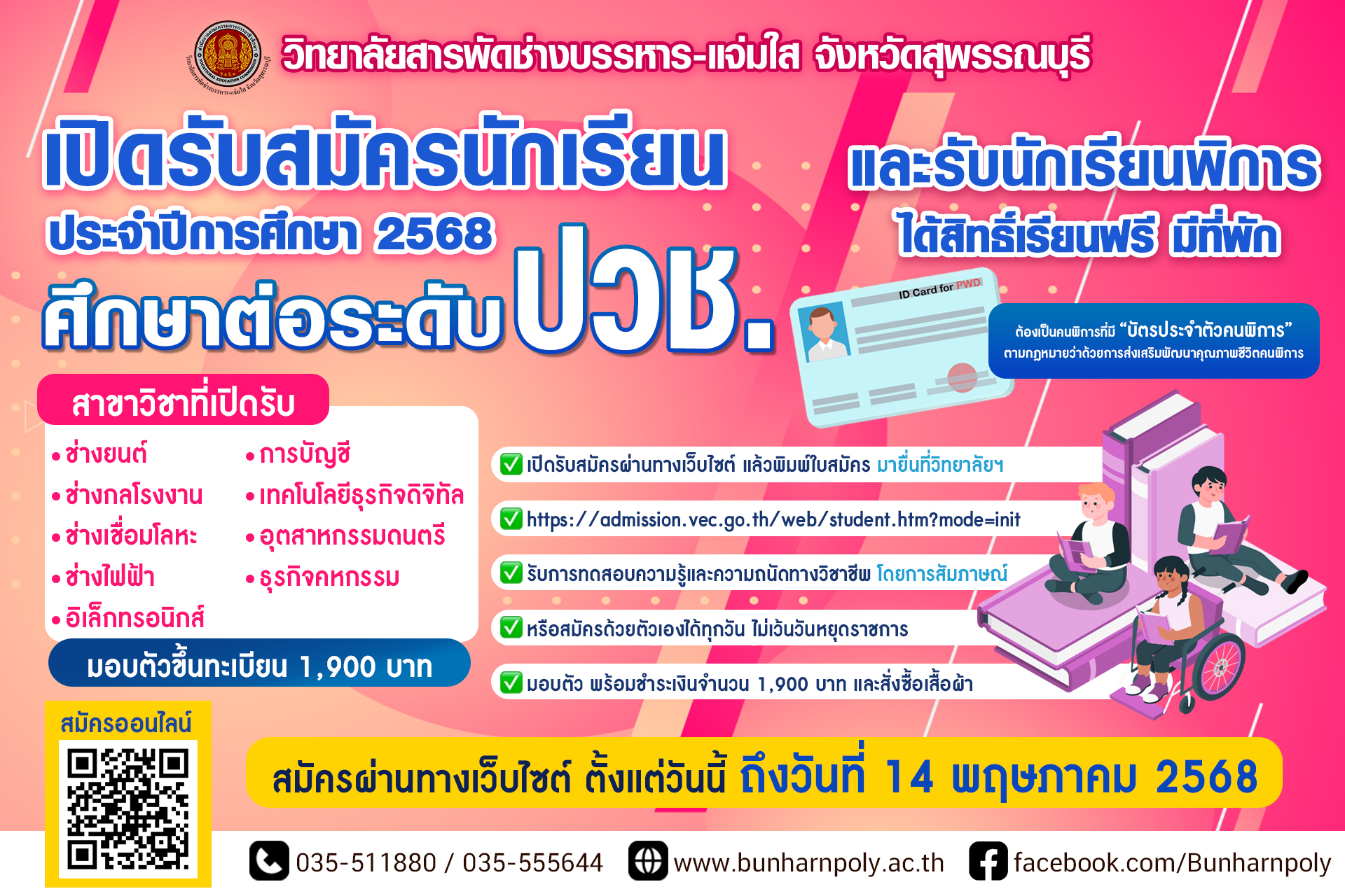 หมายเหตุ คุณสมบัตรของผู้สมัคร นักเรียน นักศึกษา ประเภทพิการ ต้องเป็นคนพิการที่มีบัตรประจำตัวคนพิการตามกฎหมายว่าด้วยการส่งเสริมพัฒนาคุณภาพชีวิตคนพิการ ตามประเภทสาขาวิชาที่สมัคร